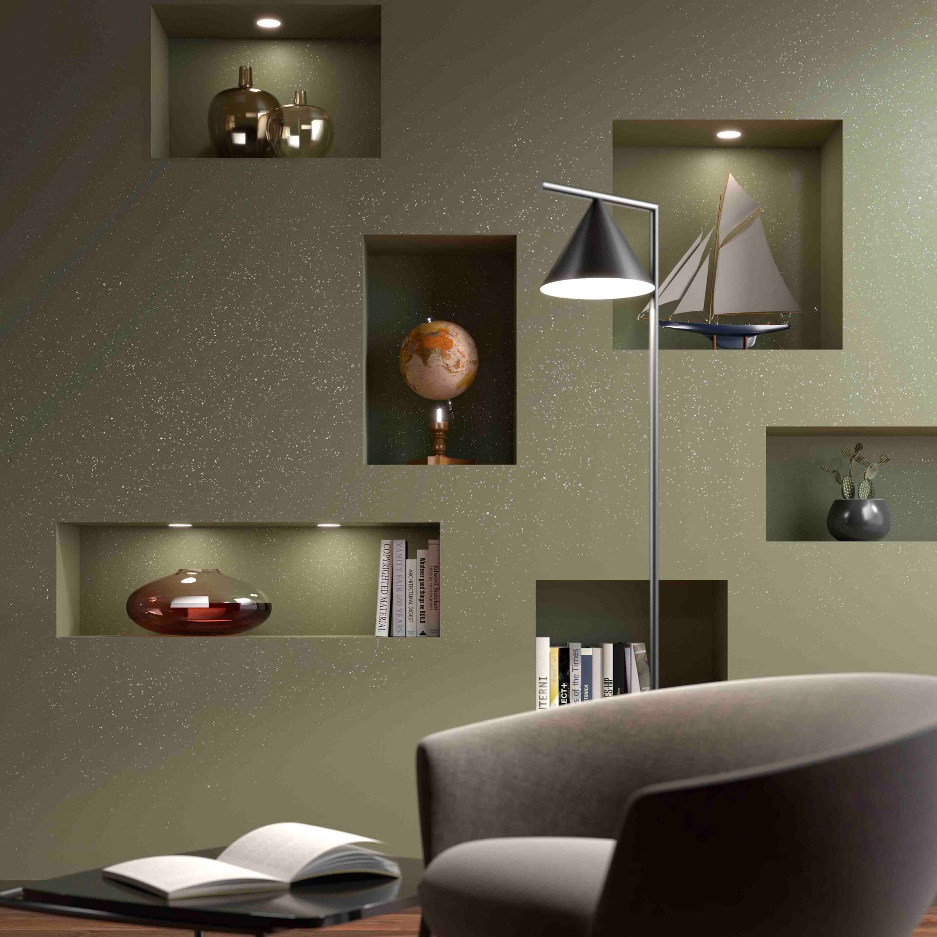 Speciale emulsione gel neutra, che decora le pareti con minuscoli e raffinati brillantini argentati.