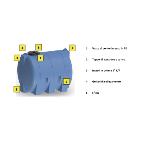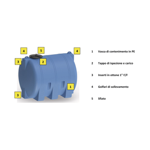 Serbatoio in polietilene, colorato in massa, protetto dall’azione dei raggi ultravioletti per lo stoccaggio di liquidi non particolarmente aggressivi, costruito nella tecnica di stampaggio rotazionale a spessore costante delle pareti, del tipo cisterna. La vasca è dotata di tappo ø 400 a baionetta femmina a tenuta impermeabile non stagna e sfiato per cui i serbatoi non sono mai sottoposti a pressioni che si discostino sensibilmente dalla pressione idrostatica ed operano a pressione atmosferica. Sono compresi in dotazione nr. 3 inserti in ottone atossico, costampati, con filetto femmina diametro 1” per eventuale collegamento di tubazioni, valvole o raccordi di riempimento e/o svuotamento del serbatoio.